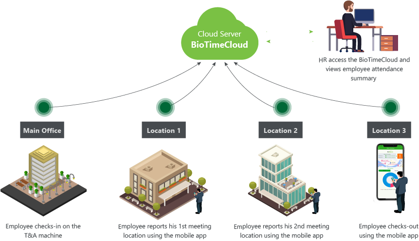 Increase employee efficiency by knowing their exact location and his/her check-ins and outs in real-time. Using the GPS mobile function, your employees can report their current location. You can view this using both web and mobile access.
