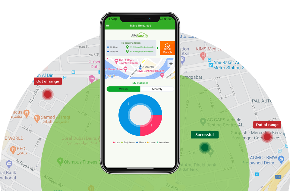 BioTimeCloud App ensures your employee is inside the check-in range. Geofencing function lets you define the allowed check-in range of a certain workplace.